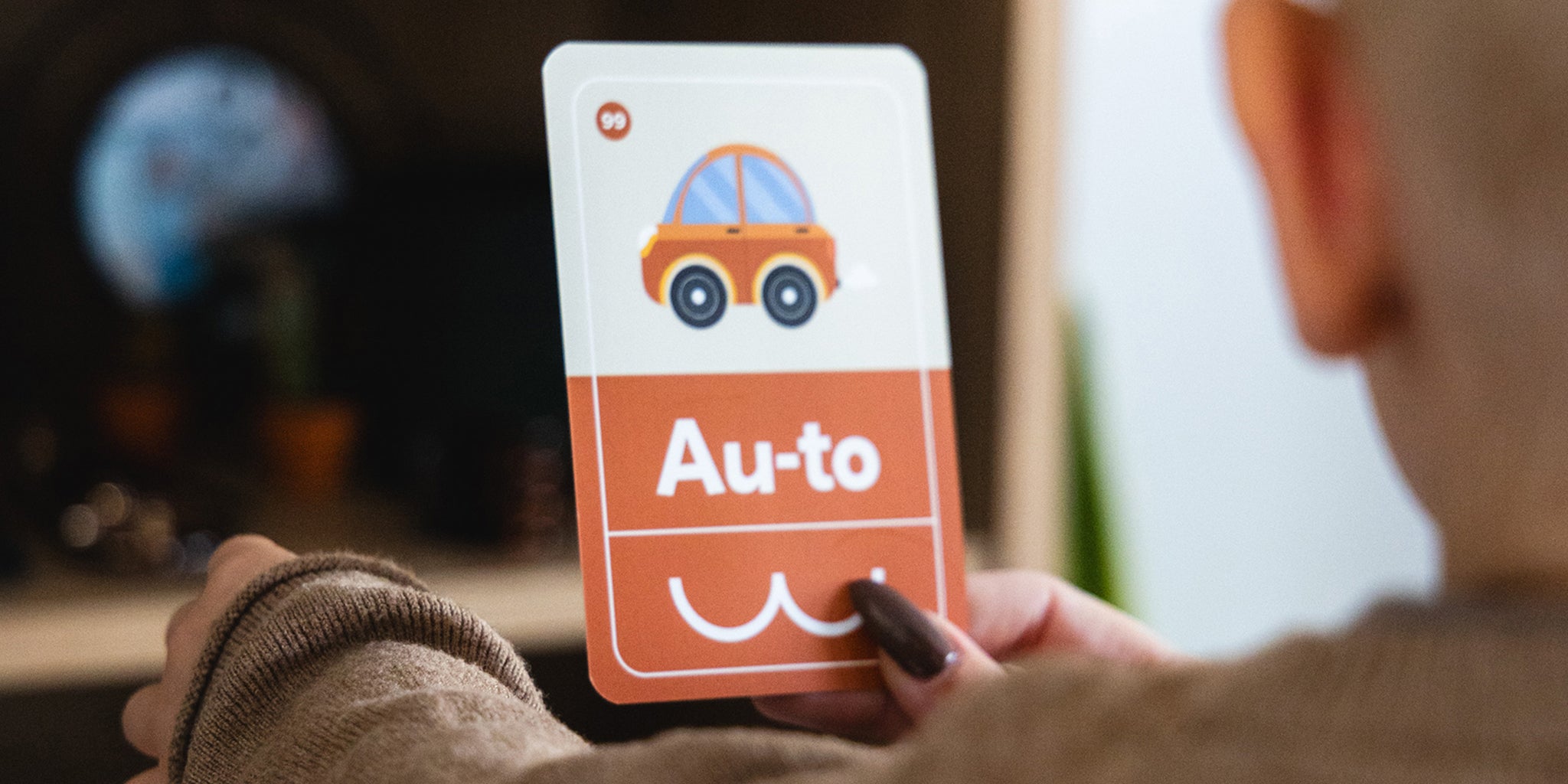 - Držte kartičky v ruce, jednu po druhé vytahujte a pojmenovávejte. Vyčkejte, až dítě slabiku zopakuje.