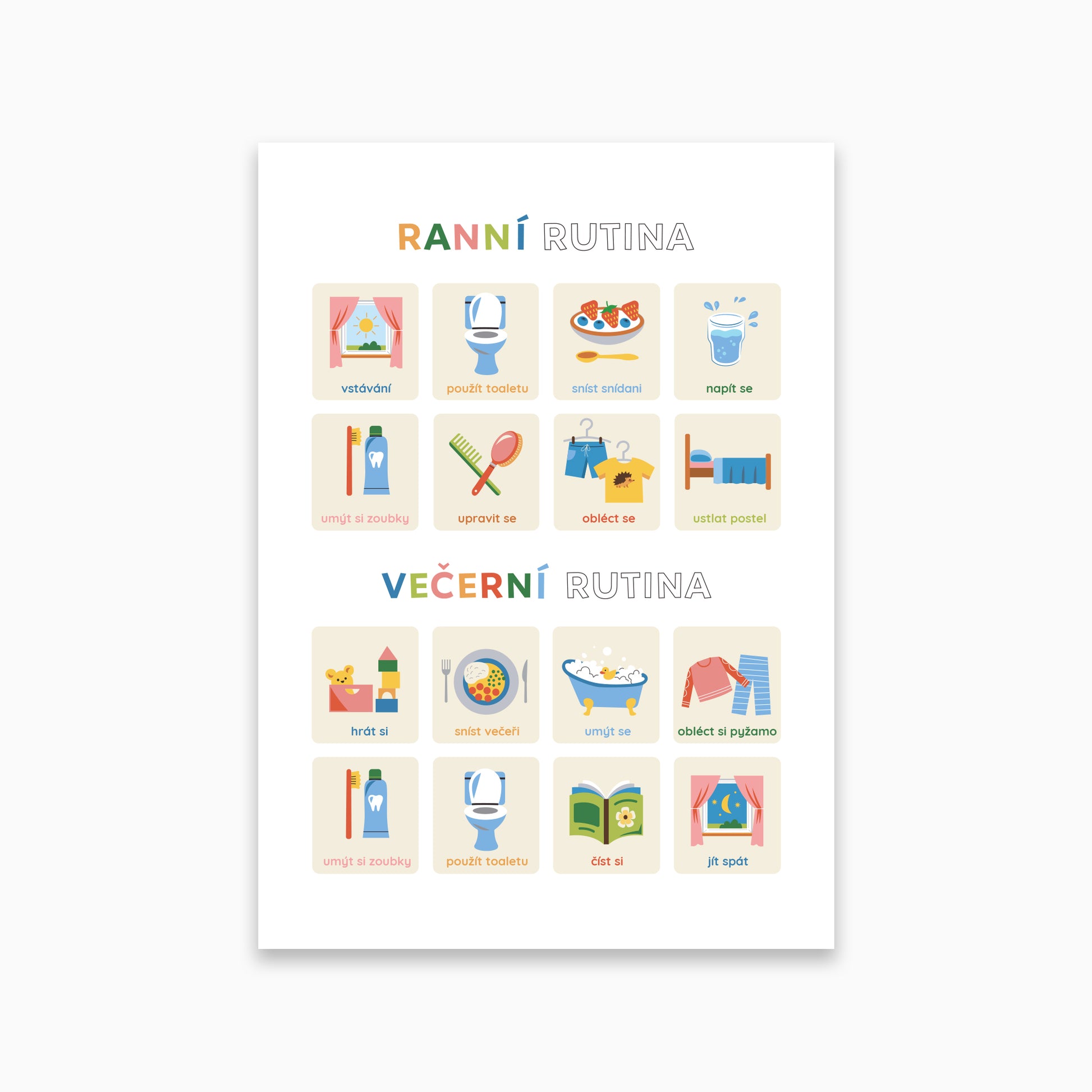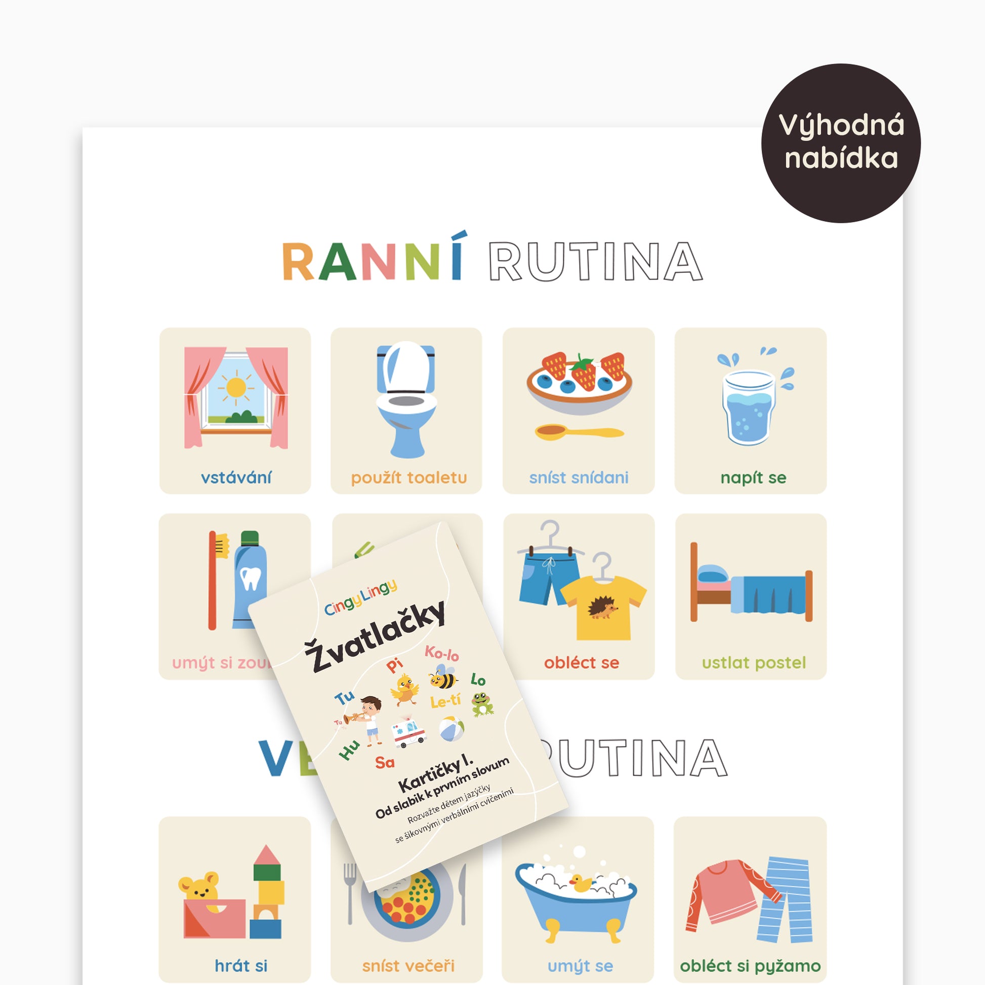 Balíček Žvatlačky I. a Plakát Rutiny spojuje vše, co dítě potřebuje k prvním slovíčkům i k podpoře každodenních dětských návyků. Kartičky pomáhají dětem krok za krokem zvládnout první slabiky a slova podle ověřených logopedických strategií, zatímco plakát slouží jako milá vizuální připomínka běžných denních aktivit, jako je vstávání, čištění zoubků či převlékání. Dohromady vytvářejí smysluplnou, hravou a motivující kombinaci, která podpoří rozvoj řeči i samostatnost – navíc za výhodnější cenu, než kdybyste produkty kupovali samostatně.