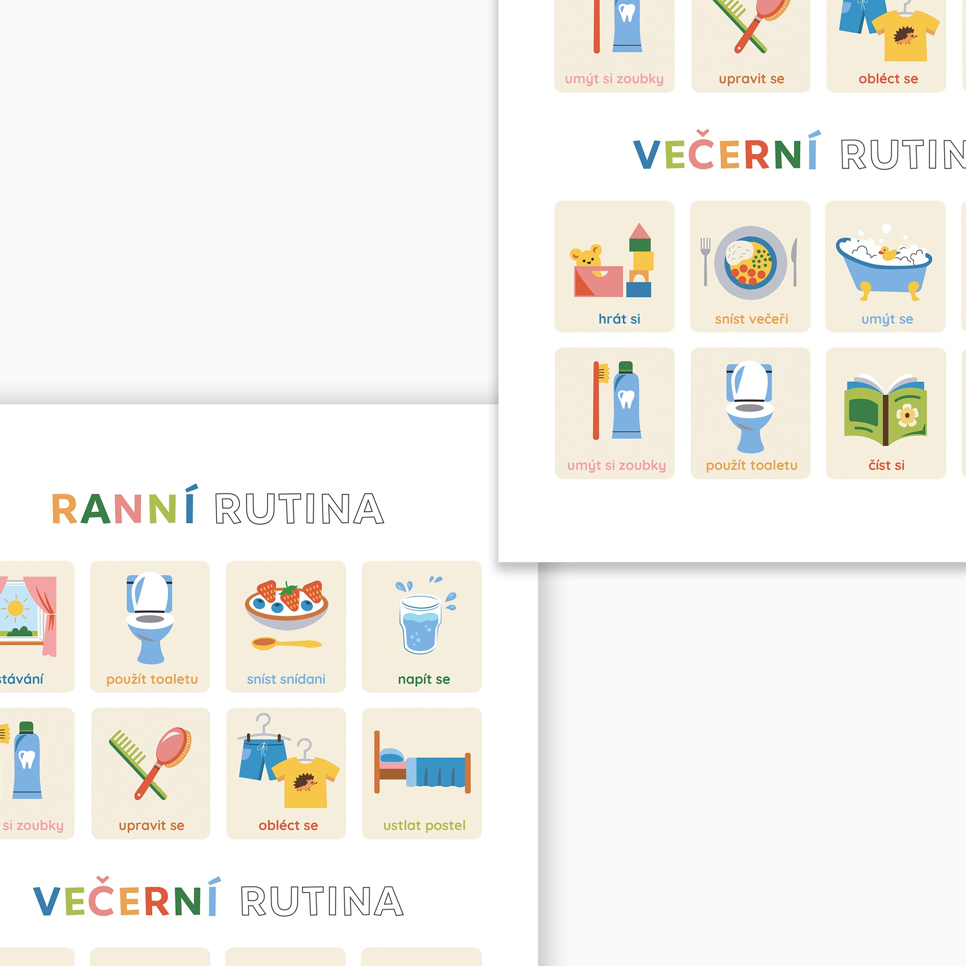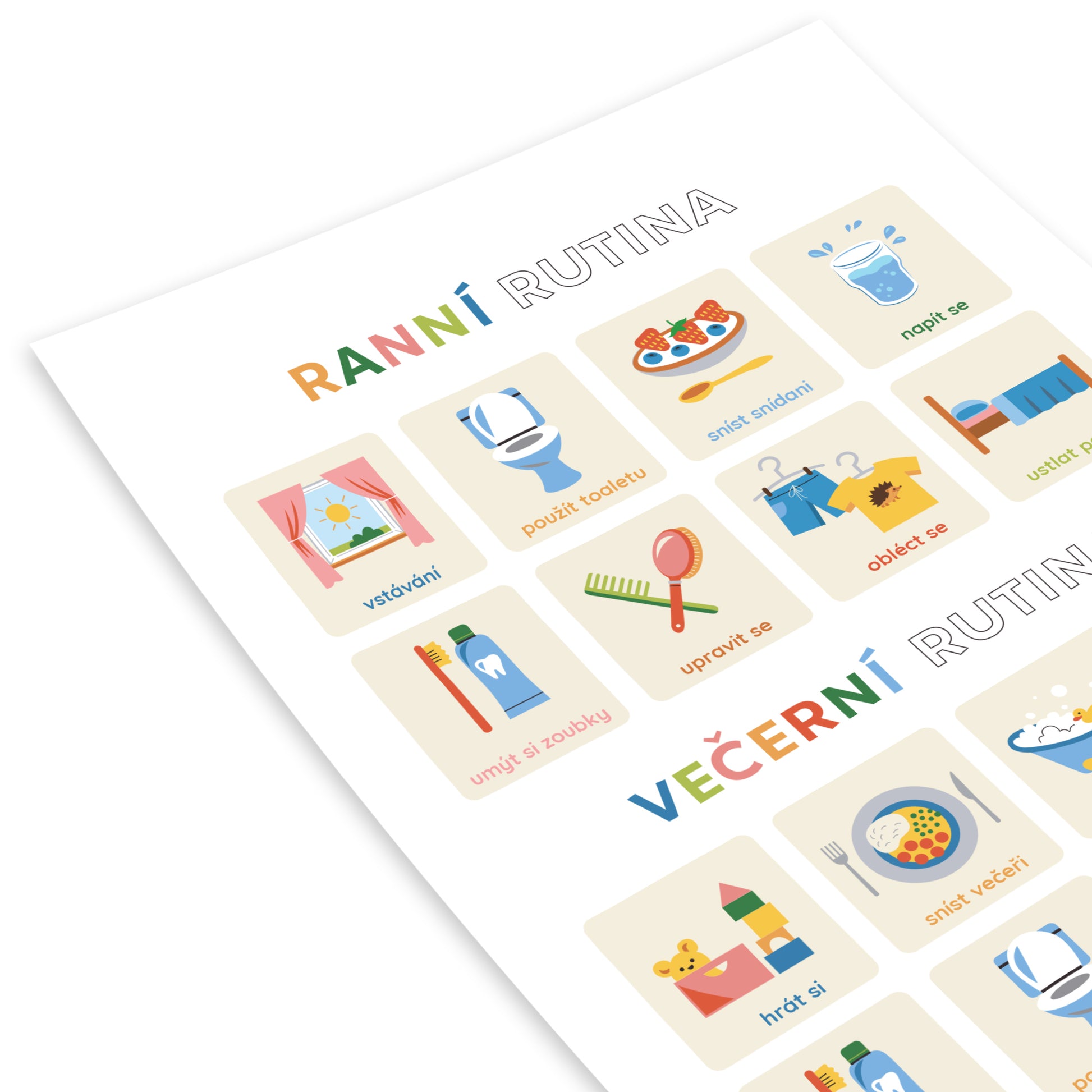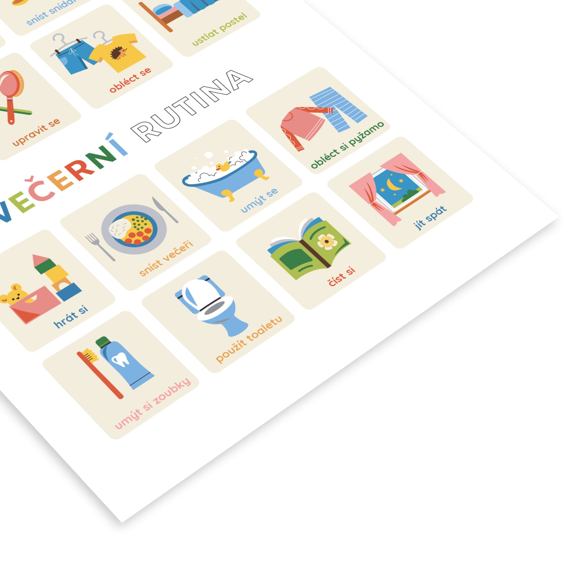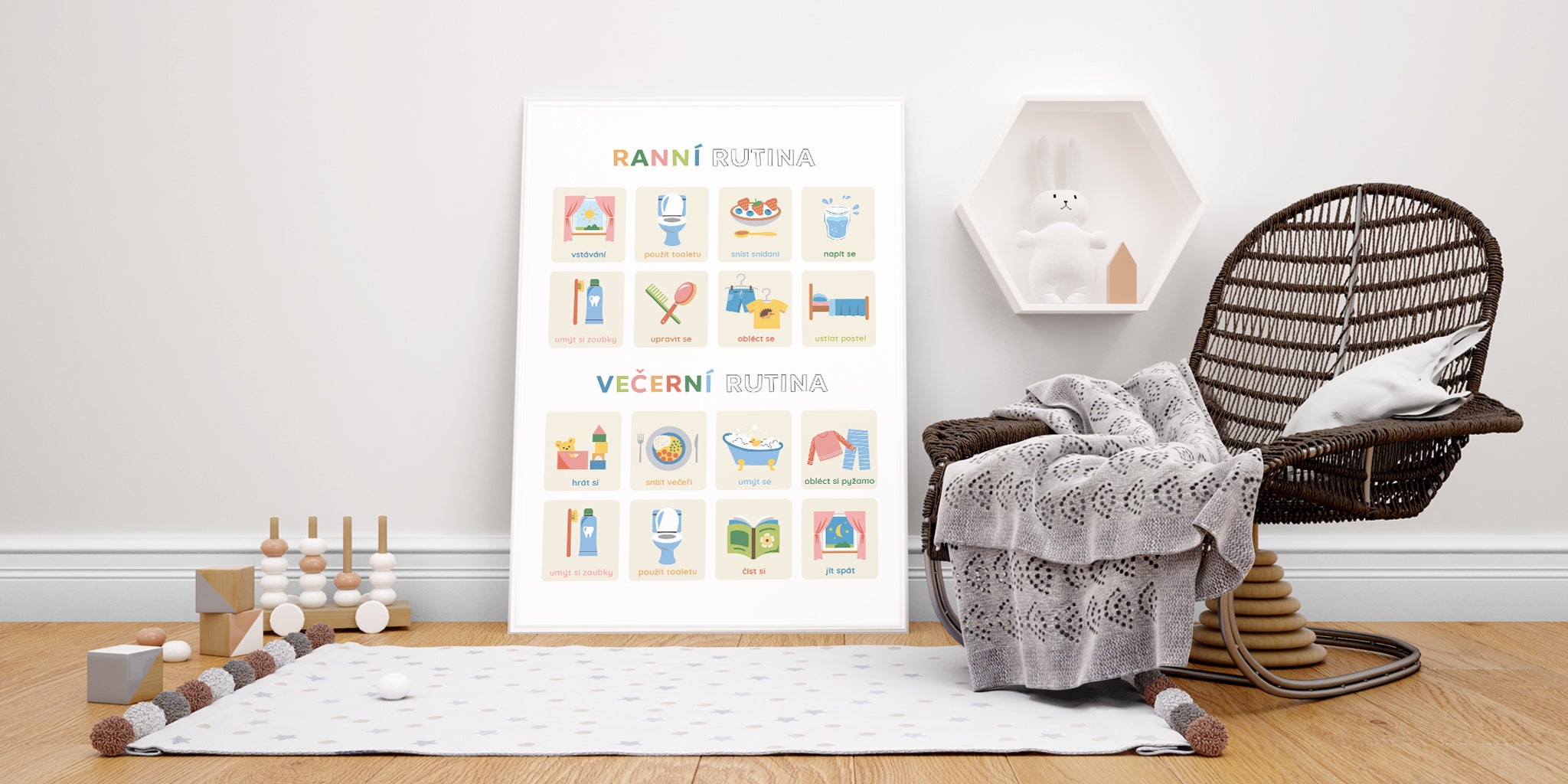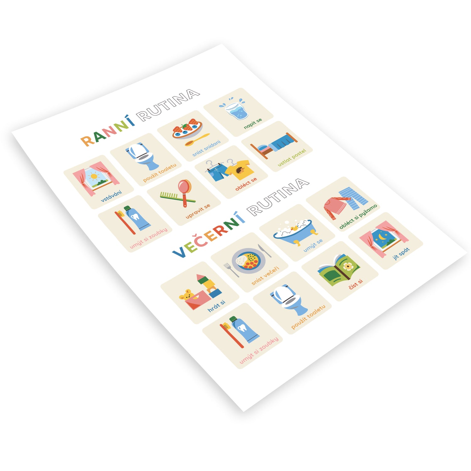 Plakát hravou formou představuje dětem nejčastější činnosti, se kterými se setkávají ráno a večer. Pomáhá jim pochopit sled událostí během dne a podporuje samostatnost i pozitivní vztah k rutině. Vizuálně přitažlivé ilustrace zároveň podněcují dětskou představivost a přirozeným způsobem rozvíjejí slovní zásobu.
