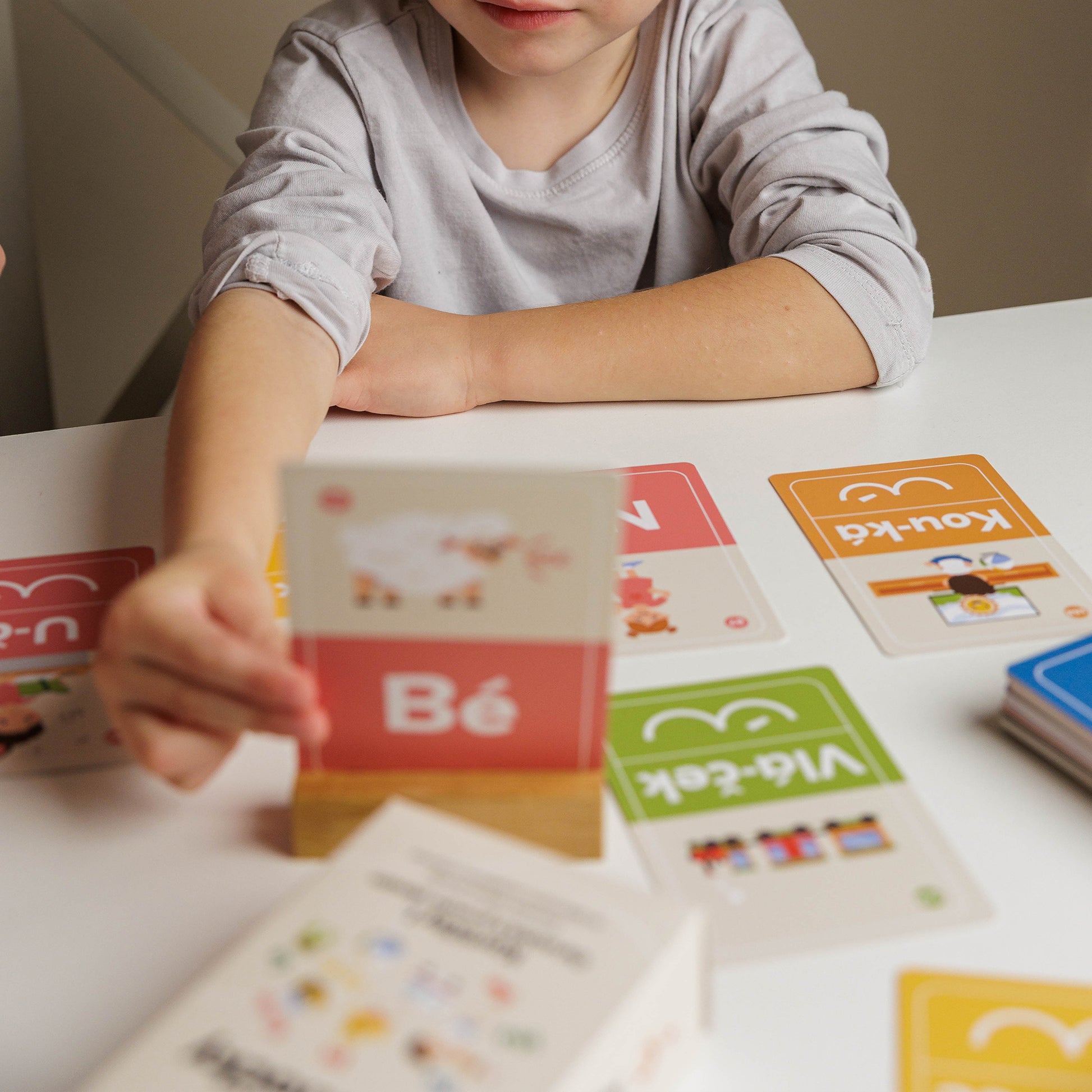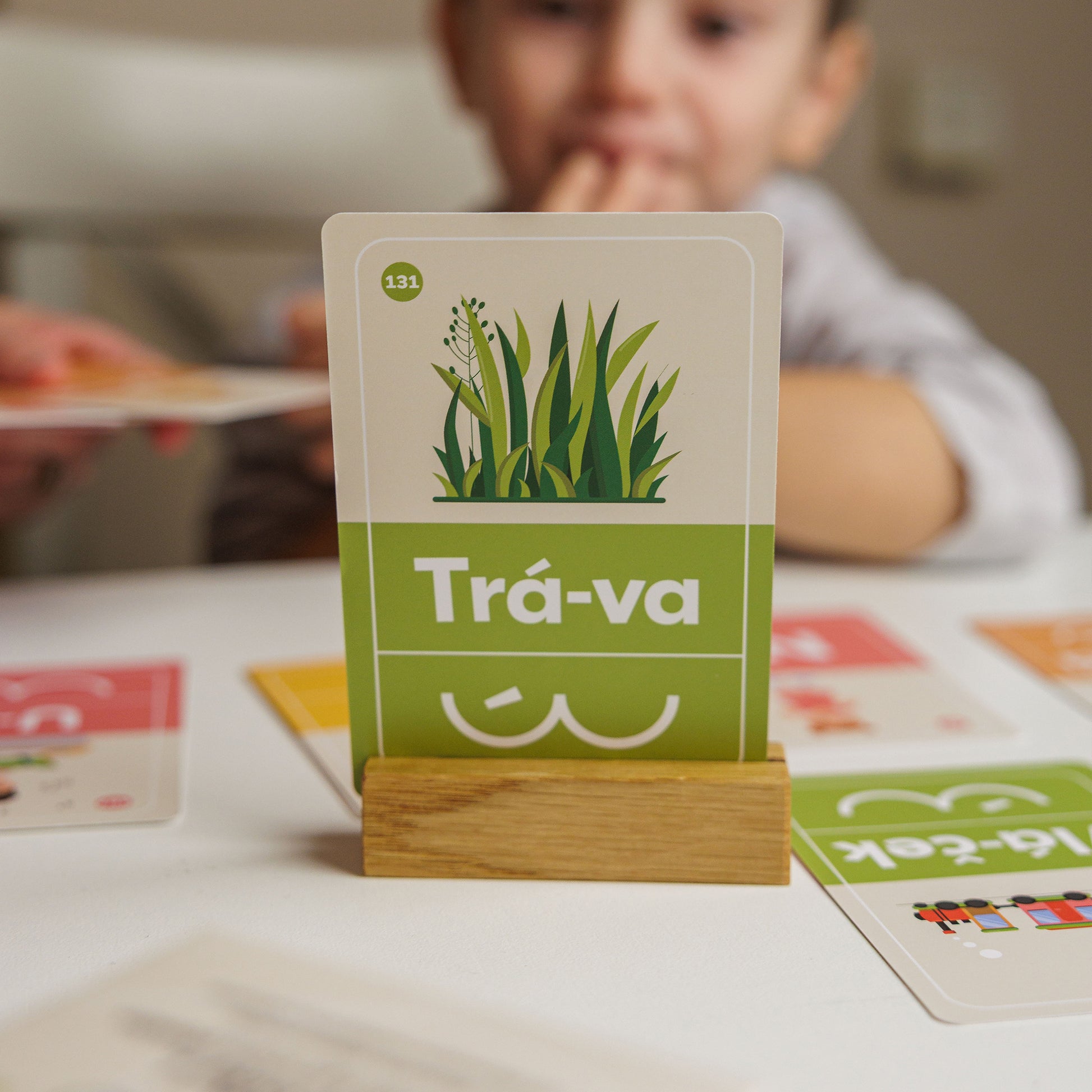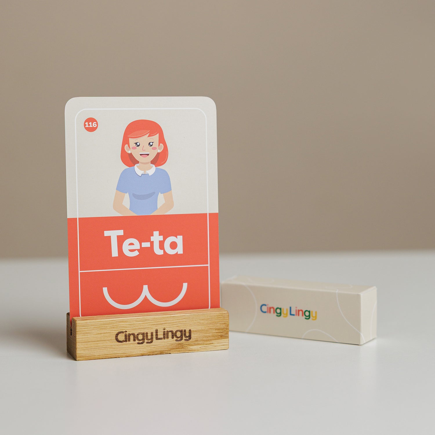 Díky praktickému dřevěnému stojanu mohou děti i rodiče kartičku jednoduše postavit před sebe a naplno se věnovat procvičování řeči. Stojan je stabilní, navržený přesně pro kartičky CingyLingy a má zaoblené hrany, aby byl bezpečný i pro nejmenší. Ošetřen je přírodním voskovým olejem, který splňuje přísnou evropskou normu EN 71-3 – stejnou, jaká platí pro laky na dětské hračky. Díky tomu je zdravotně nezávadný i při kontaktu s dětskou pokožkou.