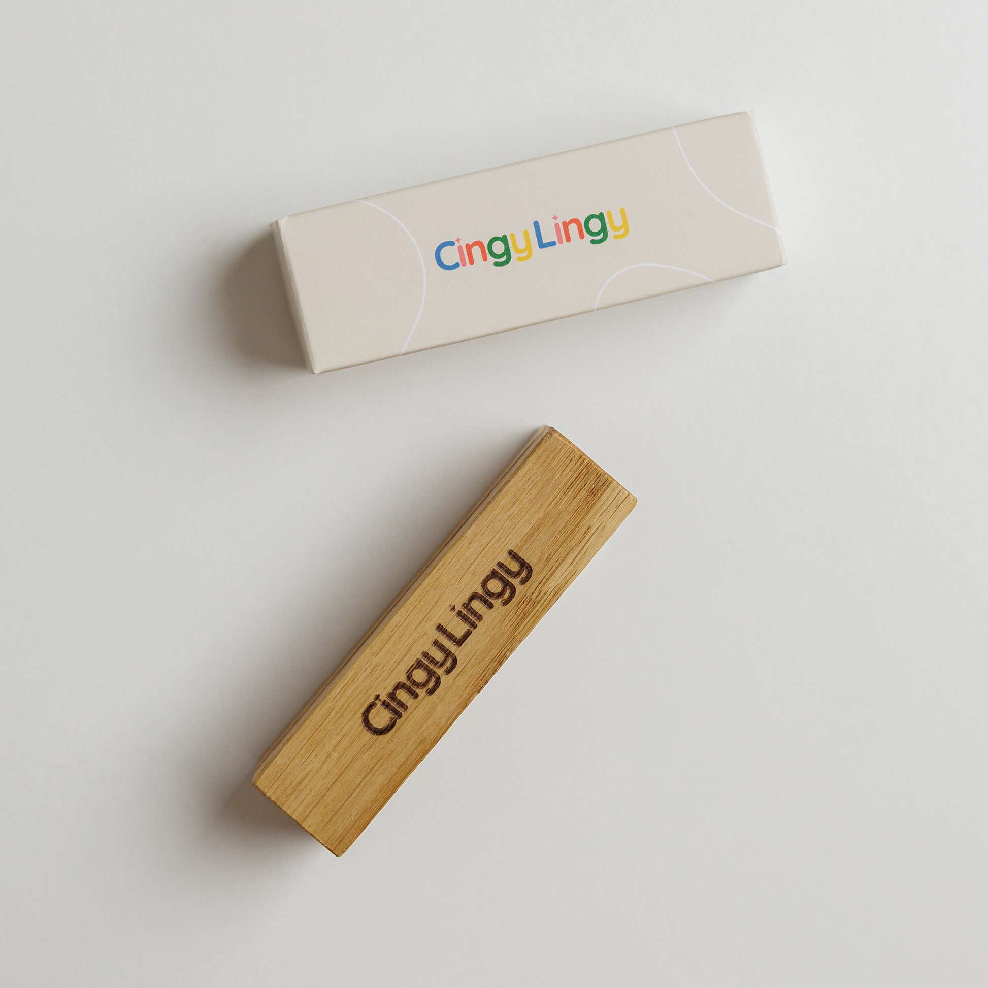 Stojan má rozměry 8 × 2 × 2,5 cm, zaoblené hrany pro bezpečné používání a na přední straně vygravírované logo CingyLingy. Je ošetřen přírodním voskovým olejem, který splňuje přísnou evropskou normu EN 71-3. Ta zaručuje, že je bezpečný i při kontaktu s pokožkou – stejně jako laky používané na dětské hračky.