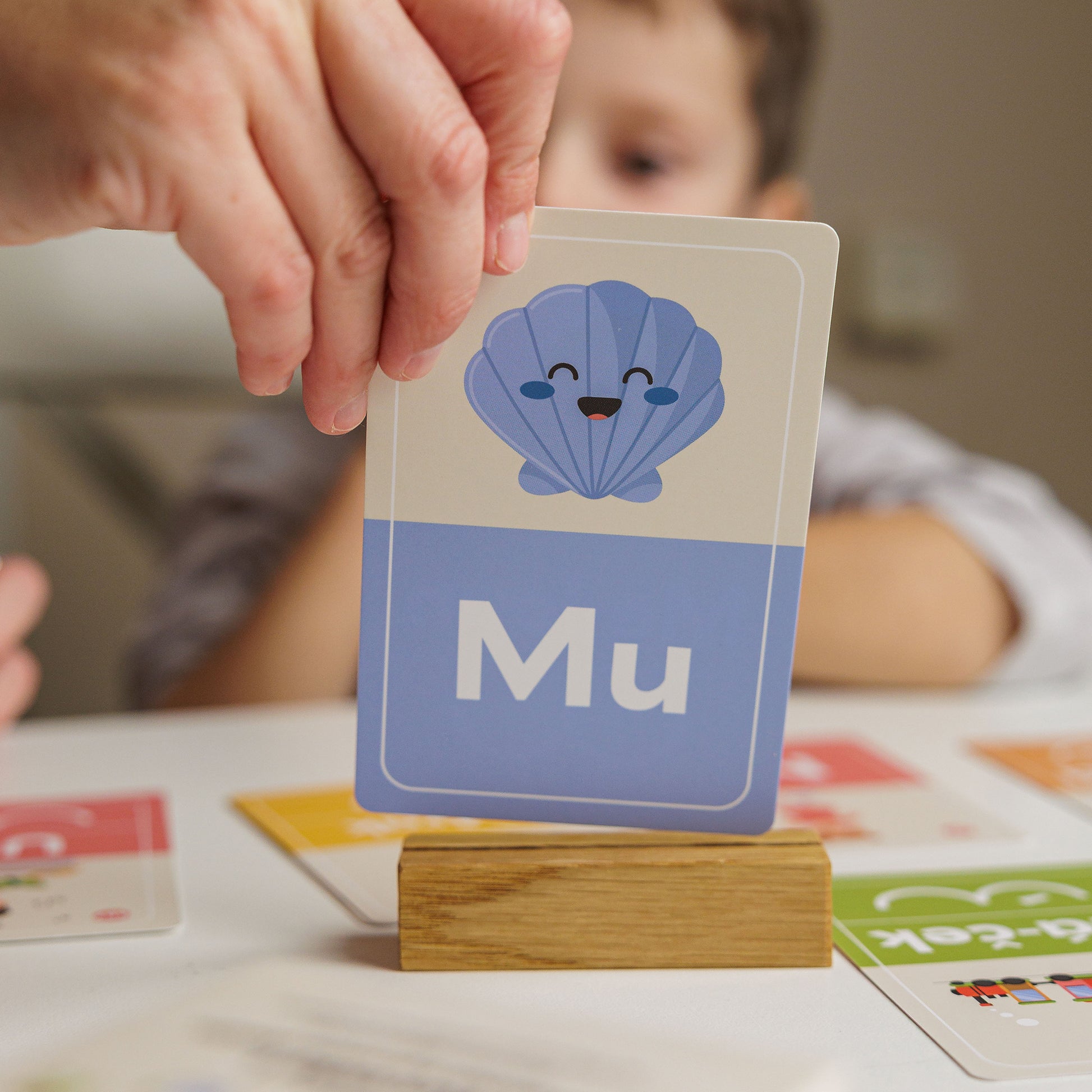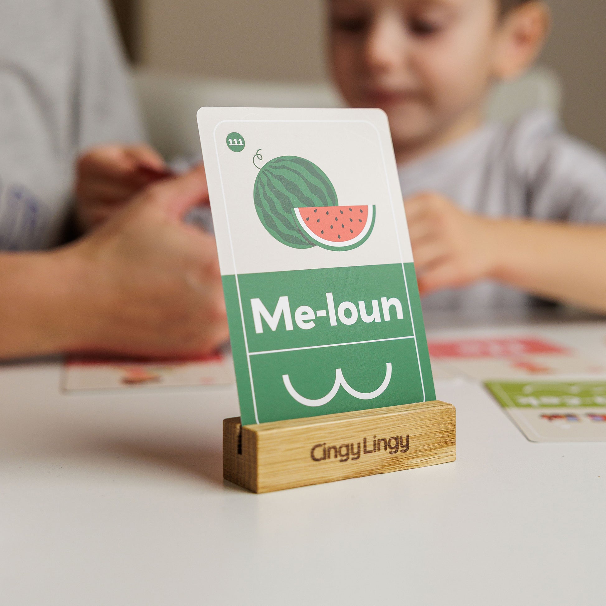 Dřevěný stojan na kartičky CingyLingy slouží k pohodlnému umístění kartiček během procvičování s našimi kartičkami pro rozvoj řeči. Dítě ani rodič tak nemusí kartičku držet v ruce, ale může ji postavit do praktického stojánku a lépe se soustředit na samotné procvičování.