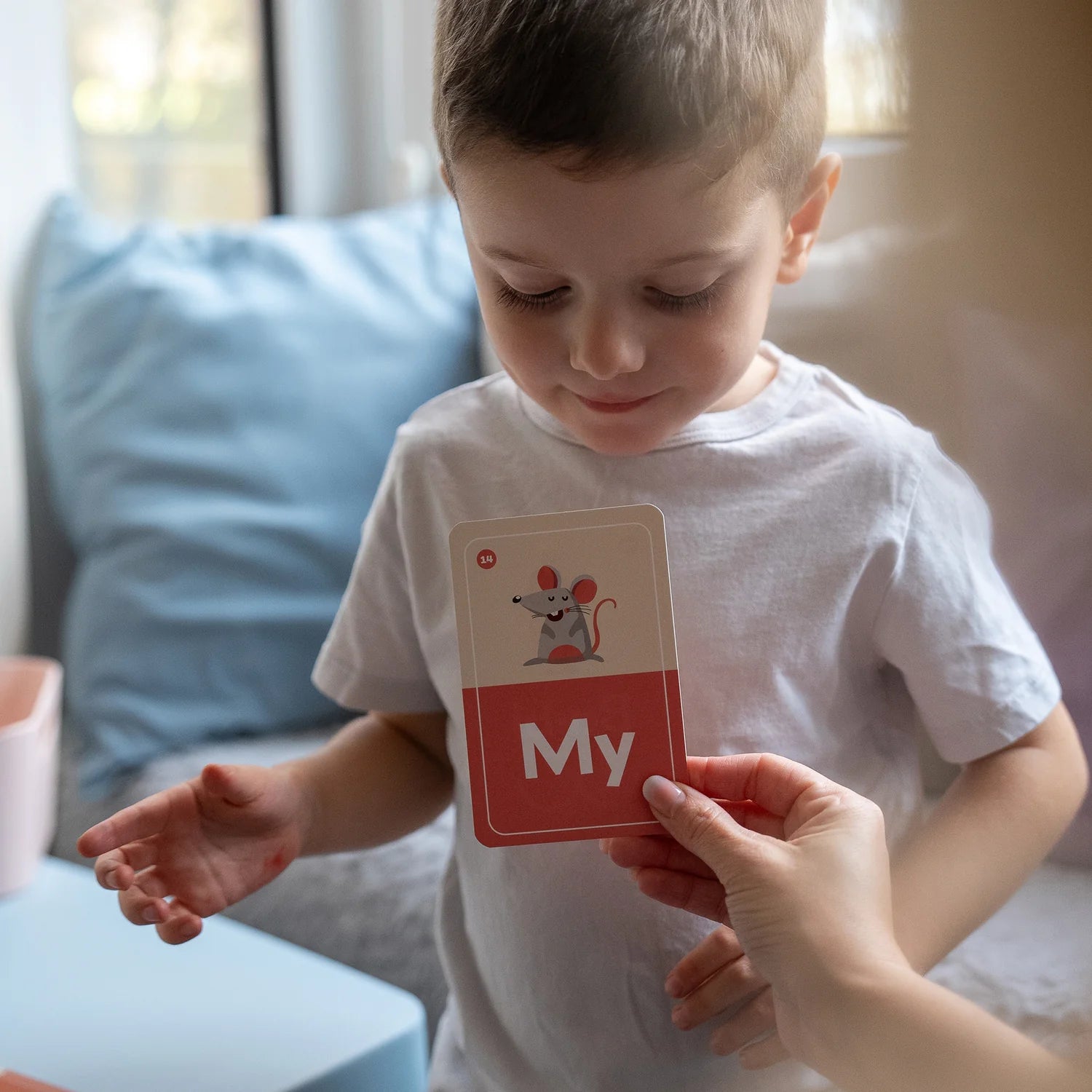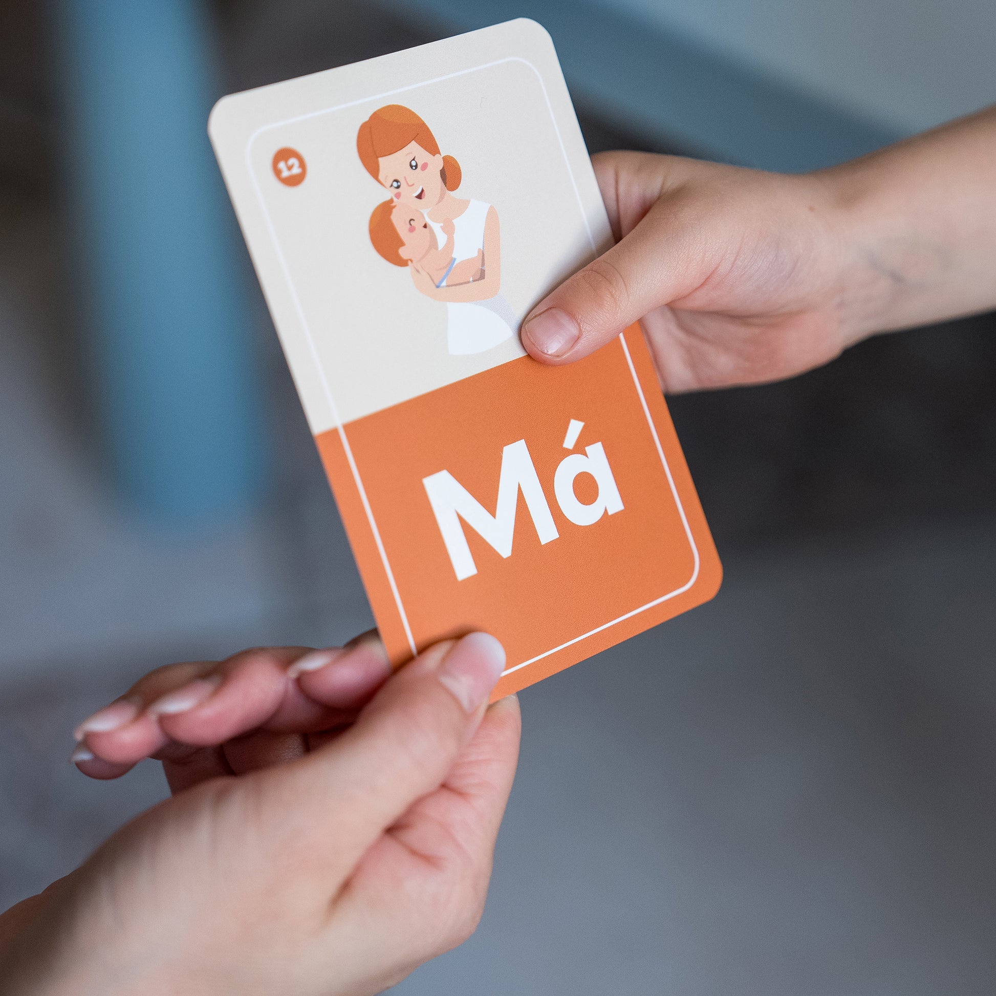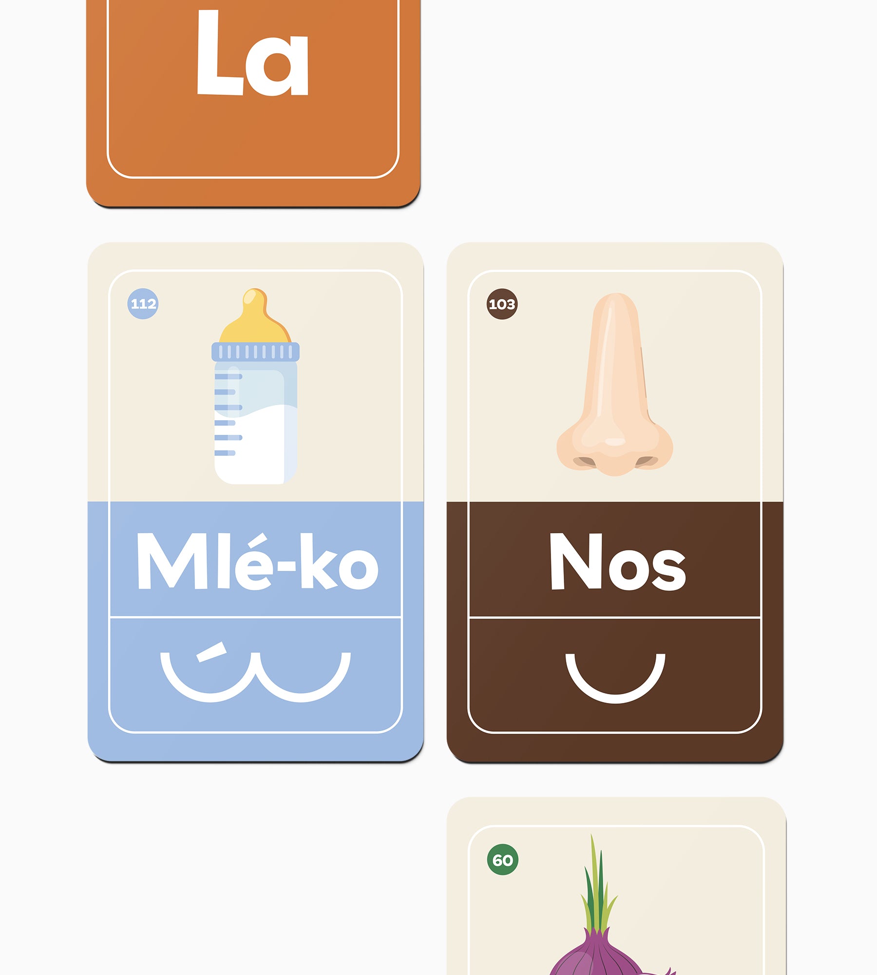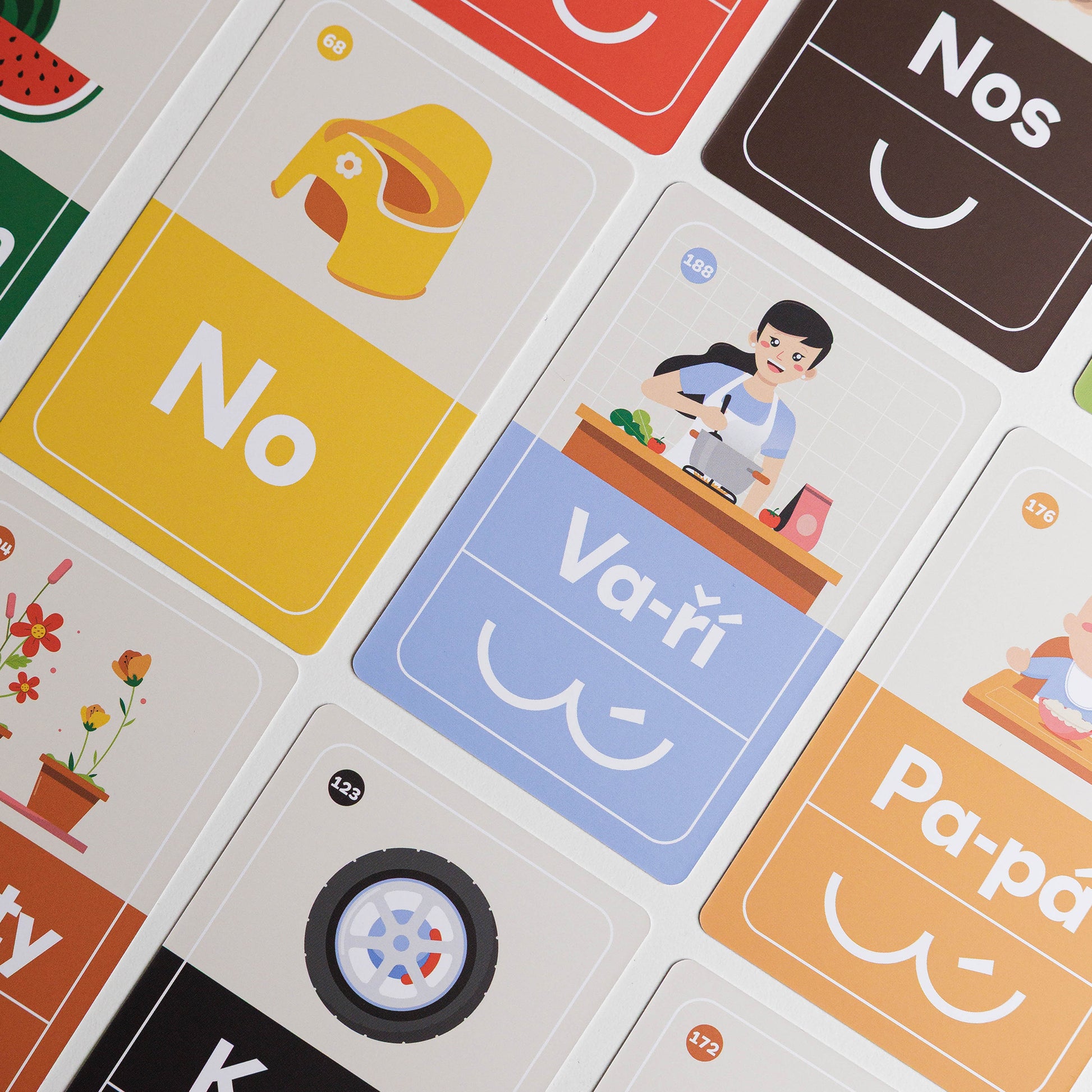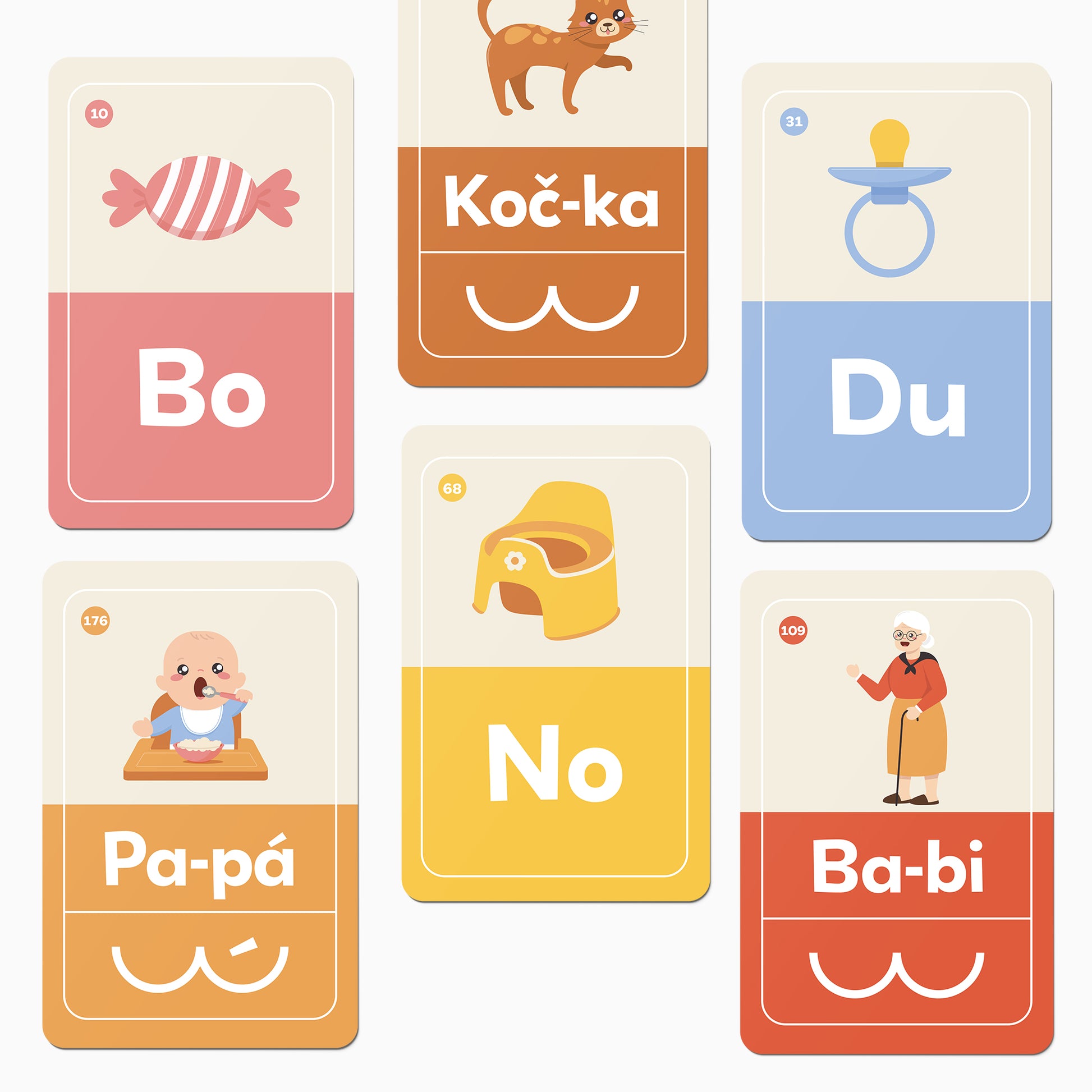 Po zvládnutí prvních hlásek a slabik objevíte 96 nejpoužívanějších dětských slov. Najdete je na druhé straně kartiček. Díky logické návaznosti na přední stranu kartičky pomohou vašemu drobečkovi pochopit ta nejčastěji používaná dětská slova.