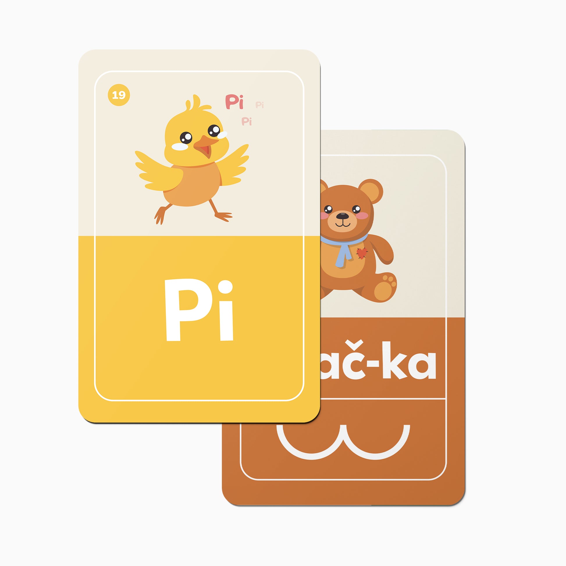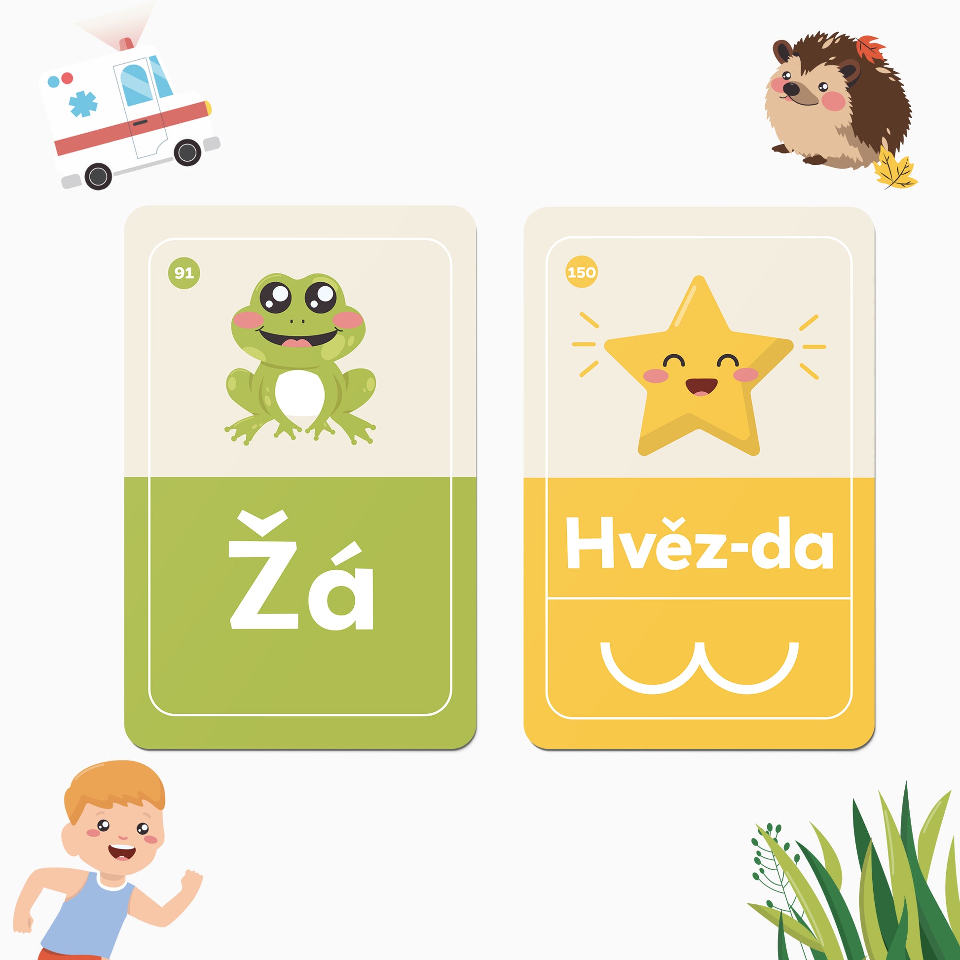 Tato sada kartiček byla vytvořena podle ověřených logopedických strategií. Podařilo se nám do ní vtěsnat celkem 96 oboustranně ilustrovaných karet (celkem až 190 ilustrací, 95 slabik, 96 slov a 1 oboustrannou vysvětlující kartičku).