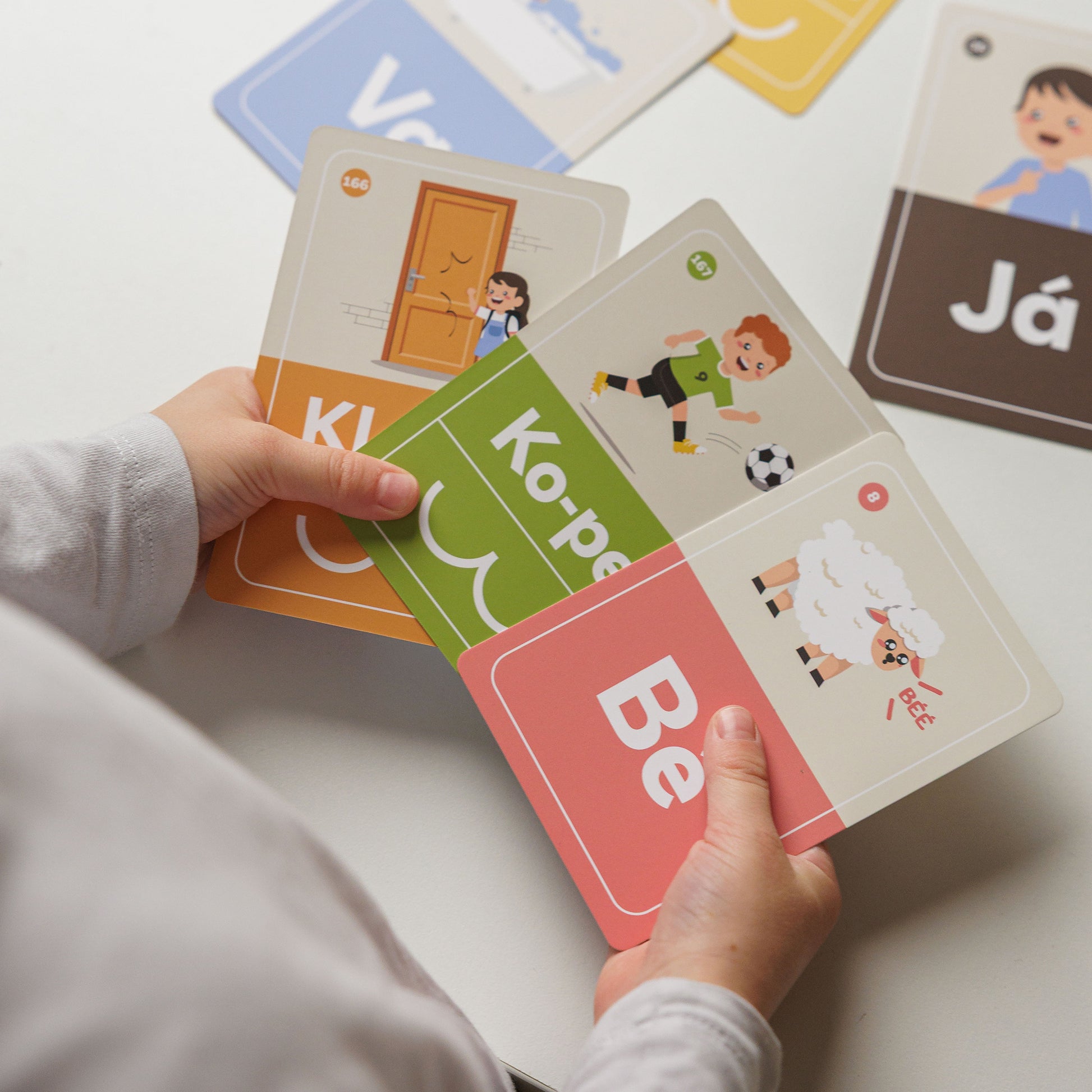 V balíčku Kartičky 1 – Žvatlačky najdete 96 oboustranných krásně ilustrovaných kartiček, na kterých se nacházejí slabiky a první slova.
