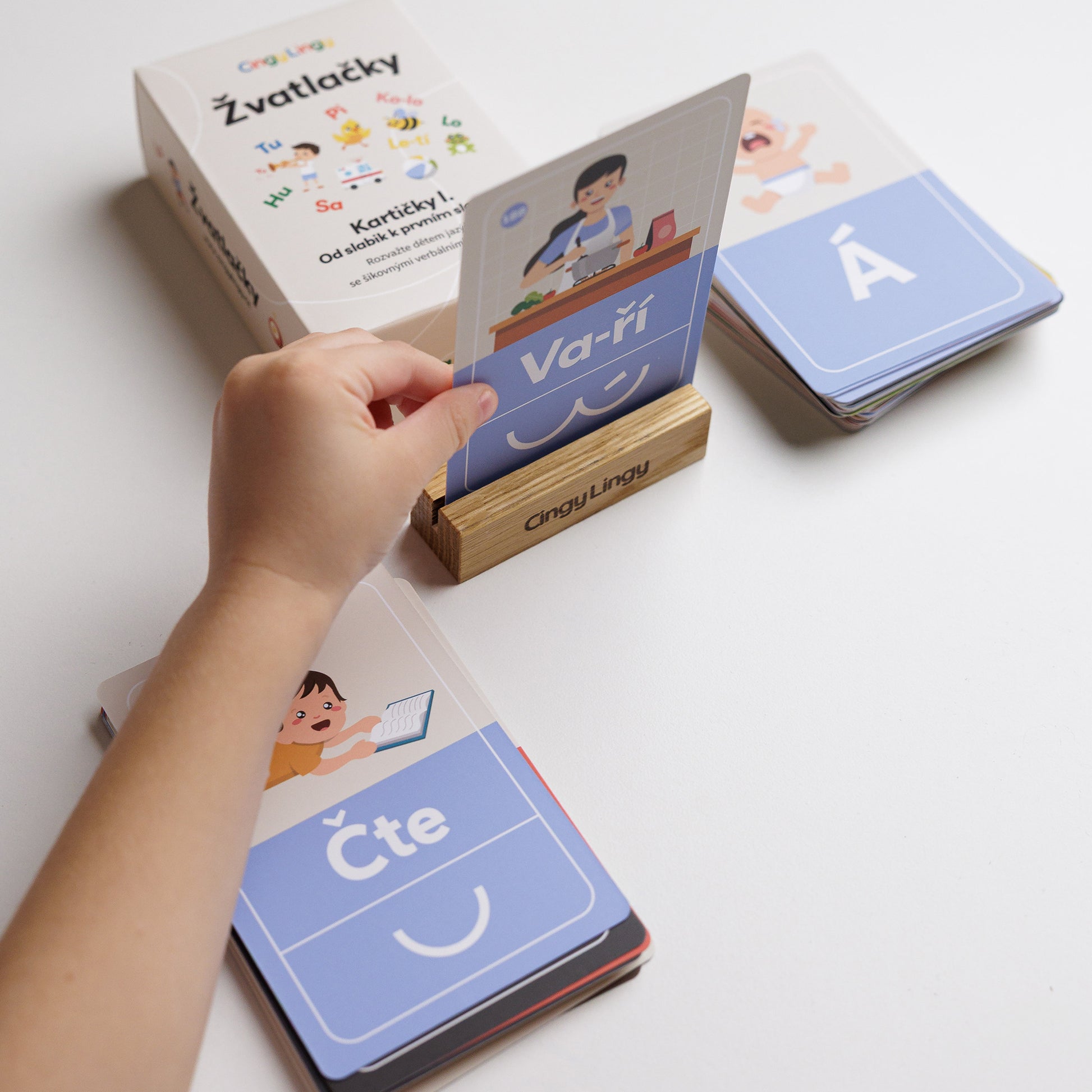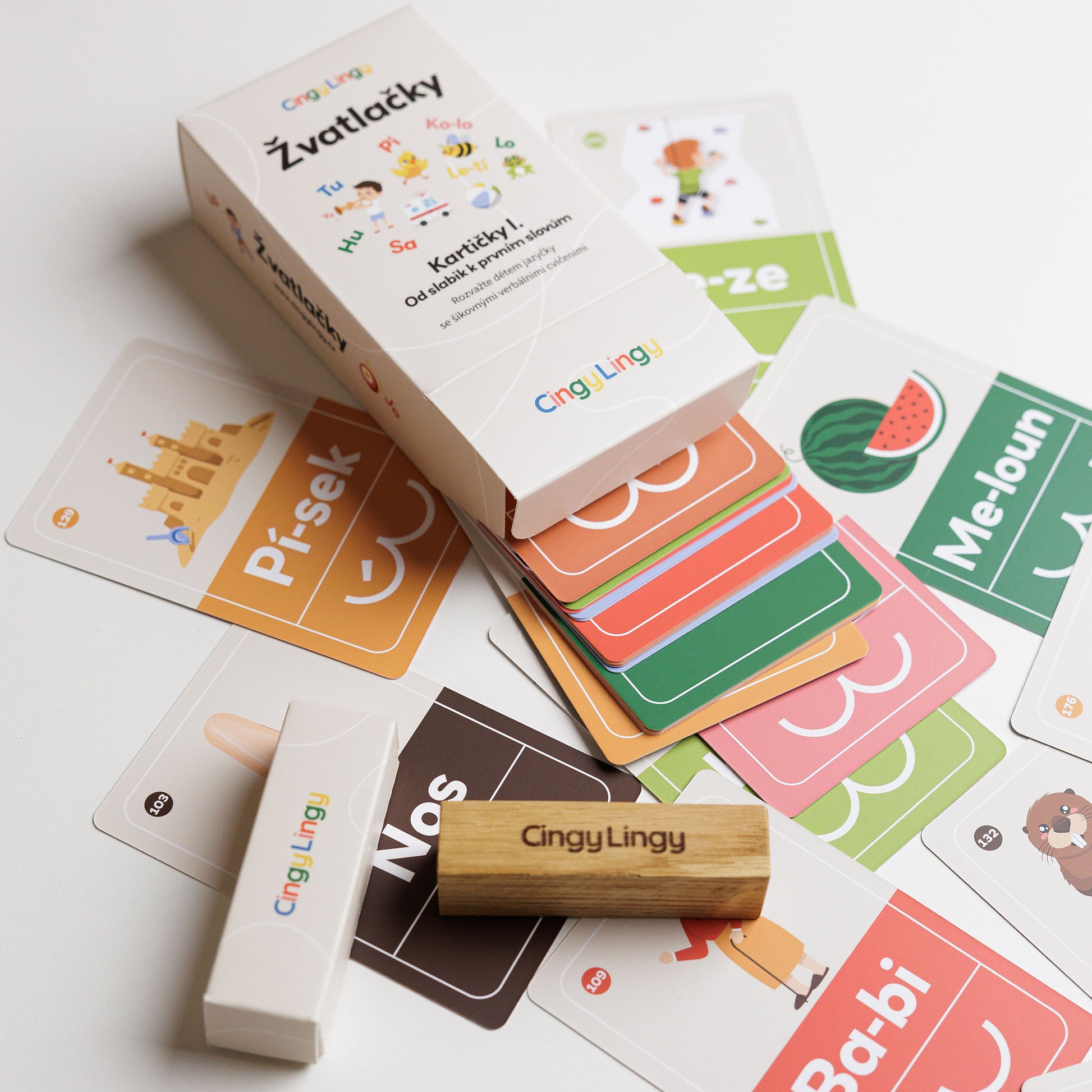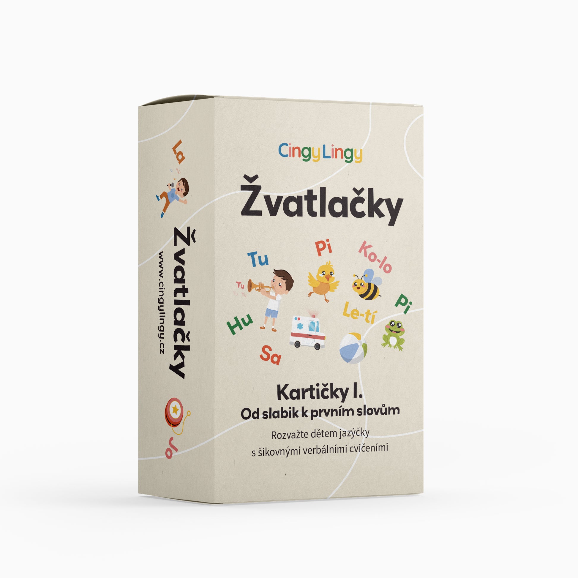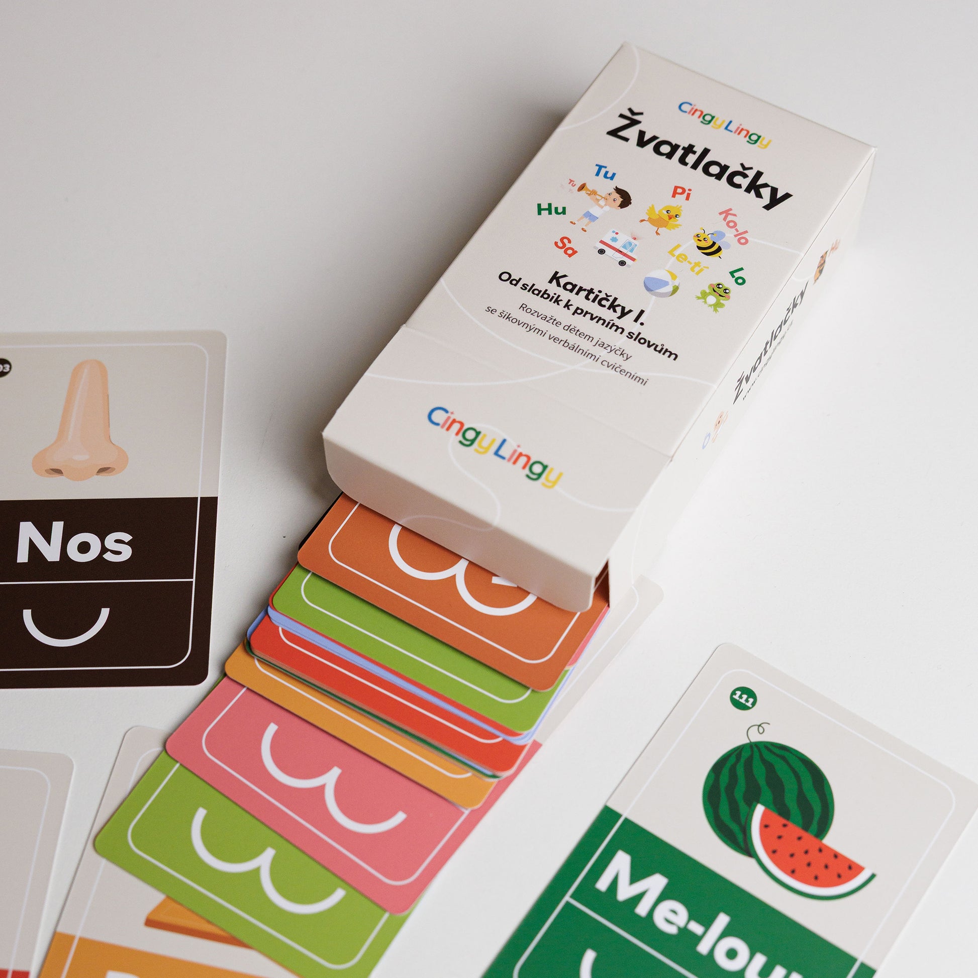 Žvatlačky I. – Od slabik k prvním slovům proto doporučujeme používat právě od 8. měsíce pro včasnou podporu vývoje řeči u miminek, ale budou skvělým pomocníkem i při pozdějším nástupu řeči. Pravidelné používání kartiček vás příjemně odmění – kolem roku a půl už od svého dítěte uslyšíte první dvouslovné věty.